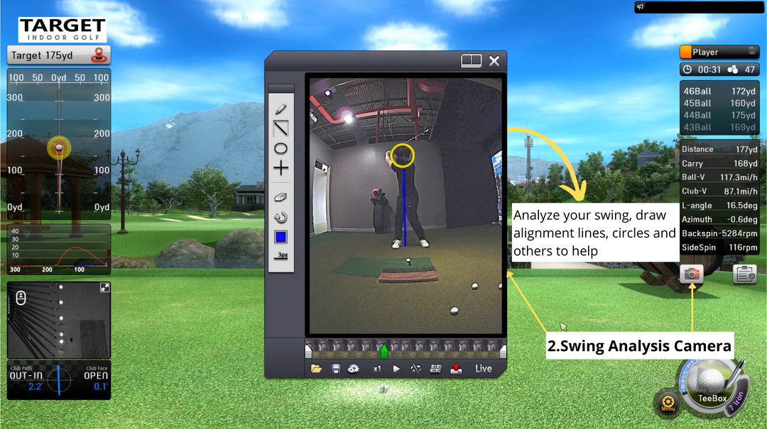 Practice with purpose using TARGET Golf Simulator’s advanced tracking system and high-speed swing camera. The system captures every detail of your swing—club path, face angle, impact position, ball speed, launch angle, and spin—in real time. This allows you to analyze your mechanics with precision, make targeted adjustments, and see the immediate effect of every swing.